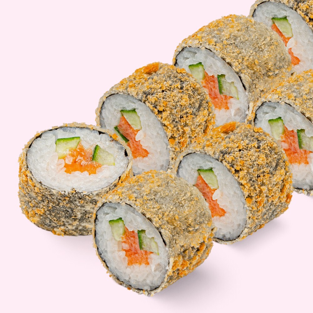 Рис, мицукан, сахар, комбу, соль, нори, лосось, лосось холодного копчения, огурец, мука, яйцо, сухари панировочные
